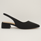 Un clásico eterno reinterpretado con delicadeza. El negro profundo viste este slingback con sobriedad y fuerza, mientras la silueta de punta afilada aporta sofisticación atemporal. El tacón bajo geométrico equilibra comodidad y estilo, convirtiéndolo en un zapato versátil para cualquier ocasión.